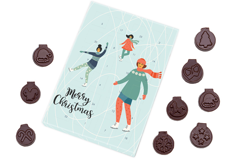 24 chocolates in shape of baubles with Christmas motifs embossed on them