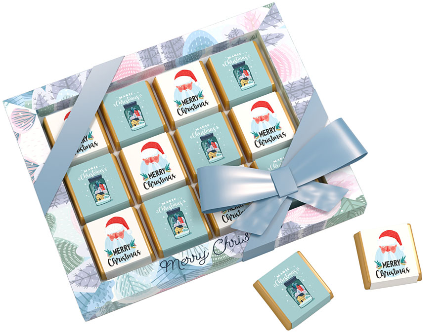 12 chocolates with delicate alcoholized cream filling wrapped in gold laminate and paper labels with promotional print.