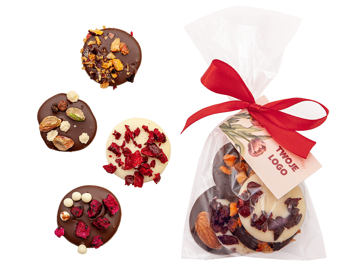 - 5 milk or white chocolate slices decorated with various freeze-dried fruits, nuts or chocolate sprinkles