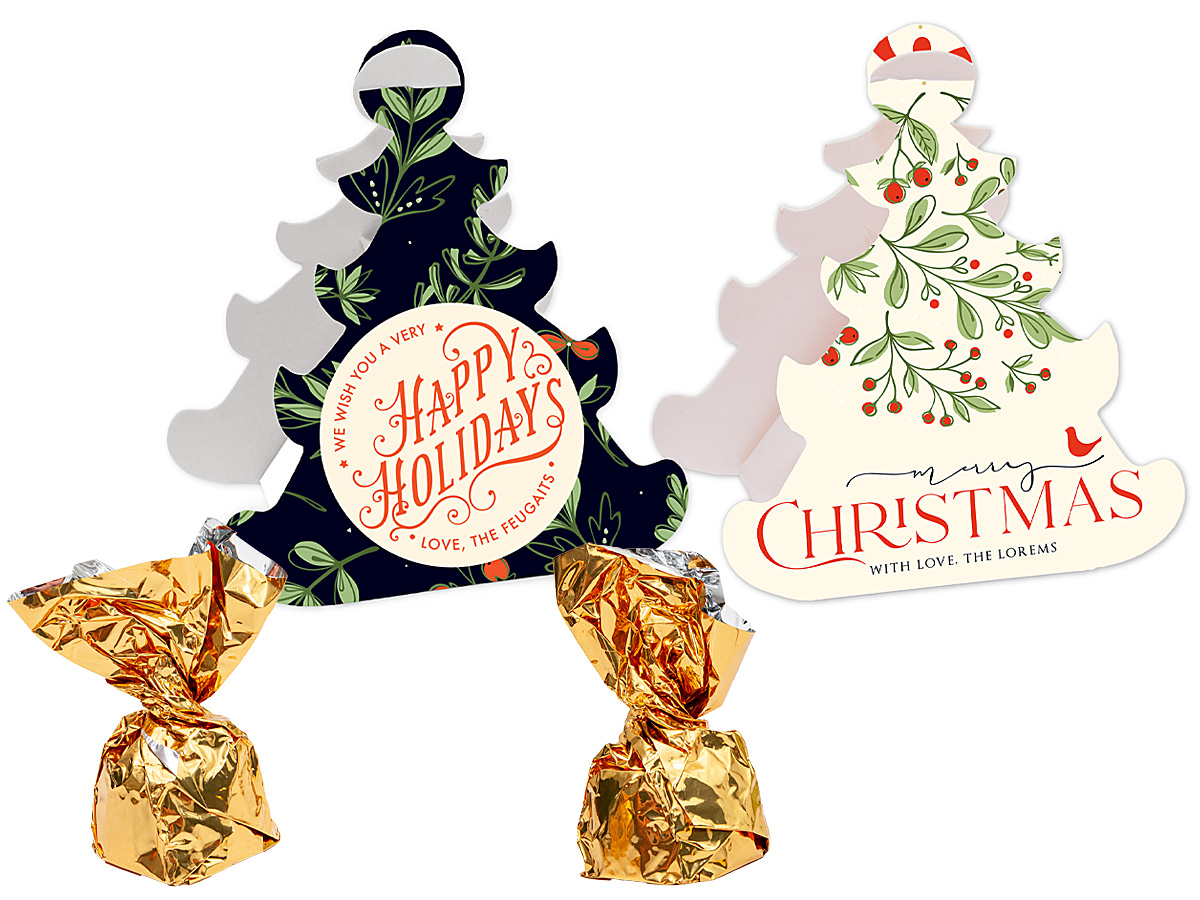 Small chocolates packed individually in Christmas tree-shaped cardboard boxes.