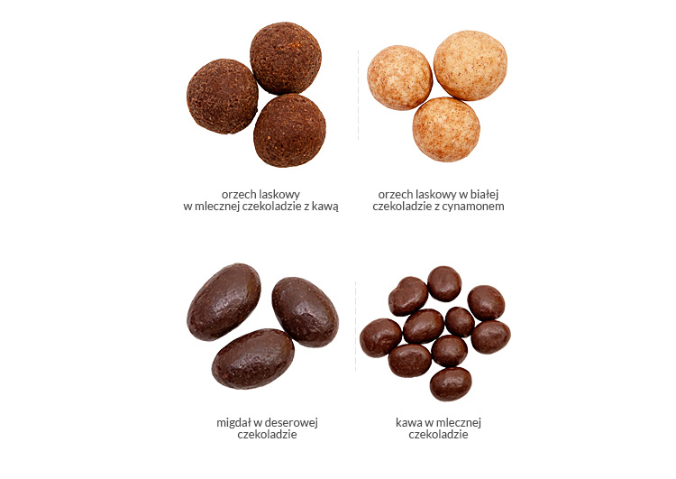 - available types: hazelnuts in milk chocolate with coffee, hazelnuts in white chocolate with cinnamon, almonds in dessert chocolate, coffee in milk chocolate
