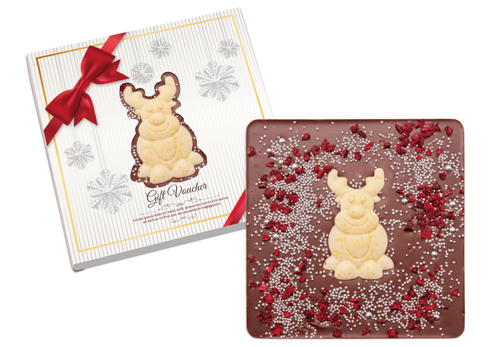 - in standard milk (44% cocoa) chocolate with reindeer made of white chocolate and covered with sugar decorations and freeze – dried fruits