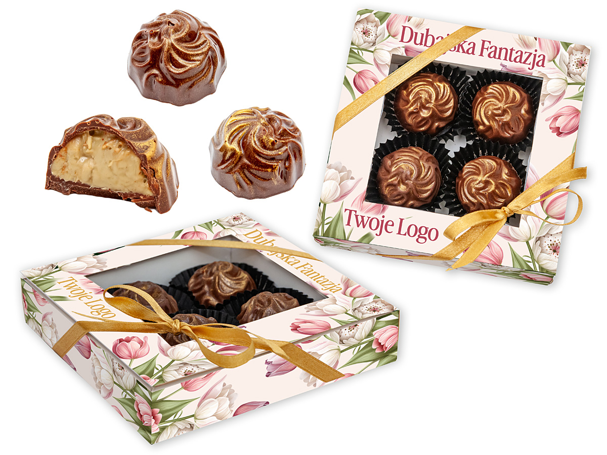 - box containing 4 excellent chocolate pralines with filling inspired by Dubai chocolate