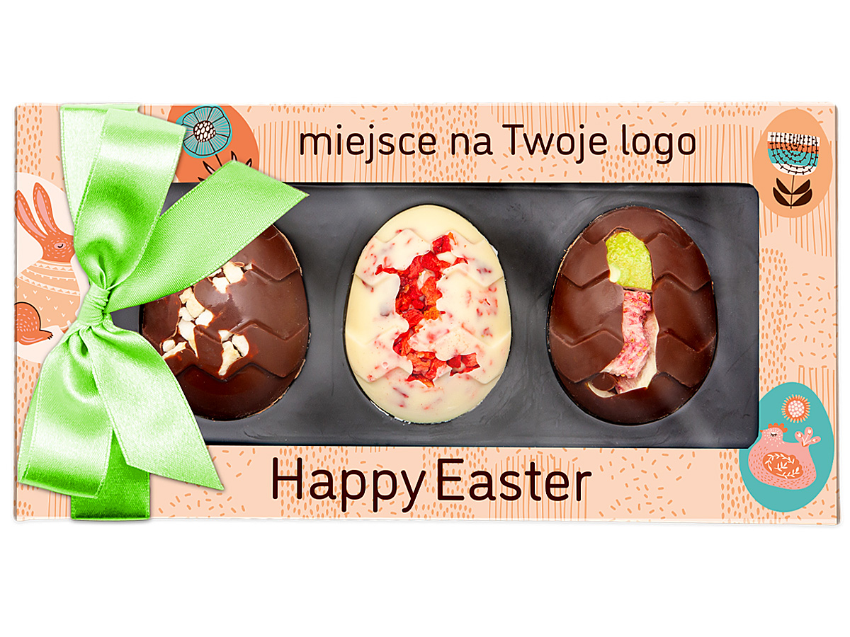 Three delicious Belgian chocolate in Easter egg shape decorated with melted freeze-dried fruits