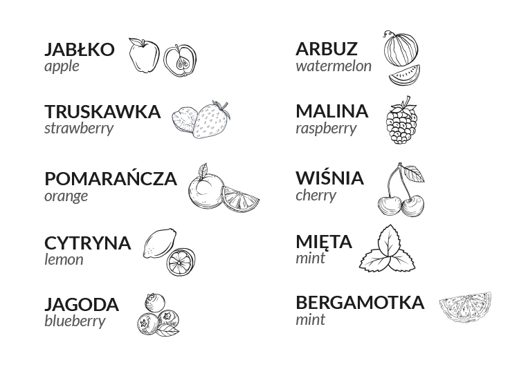 - available flavours: lemon, orange, strawberry, cherry, apple
