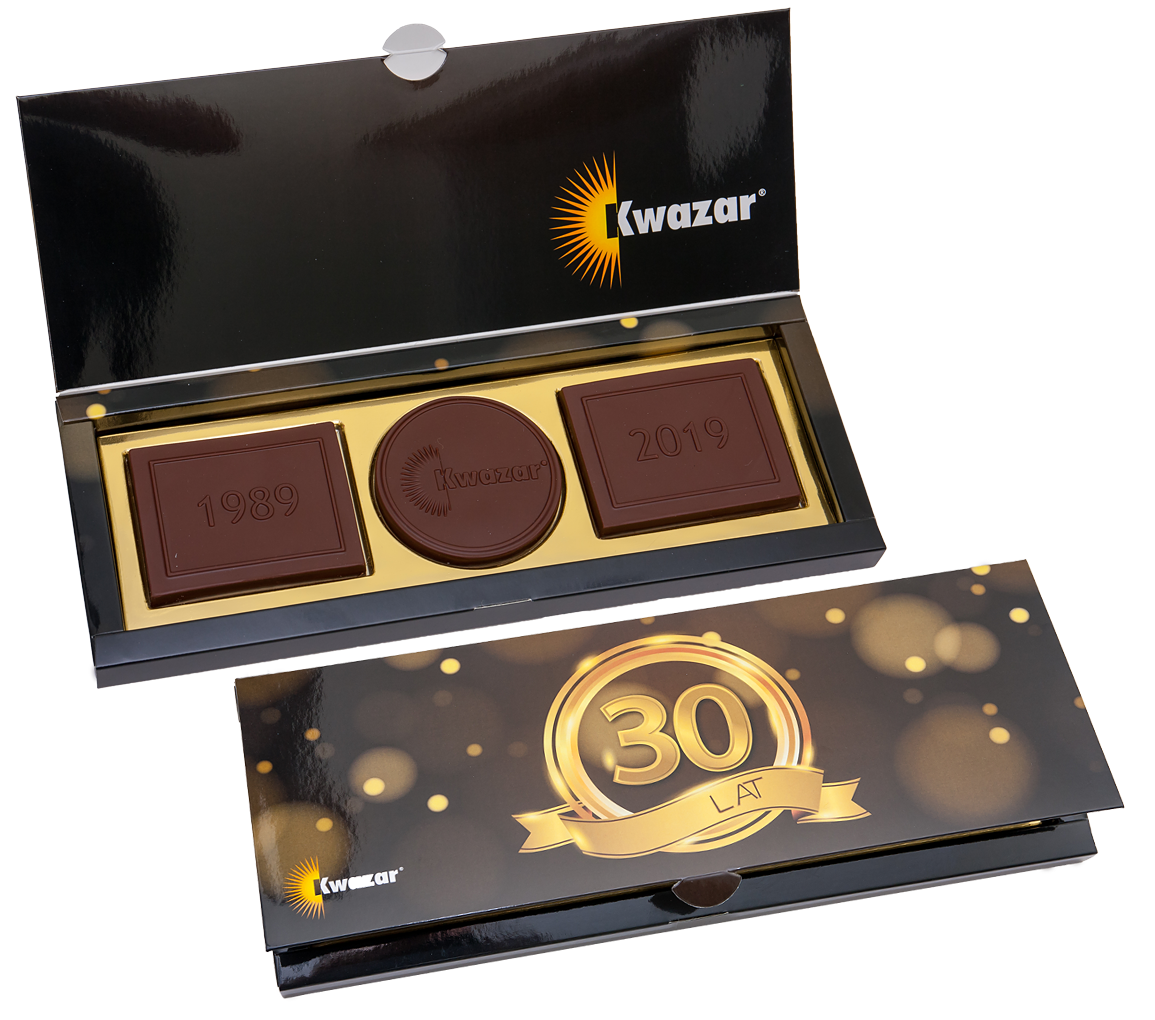 • two rectangular chocolates with establishing year and current year embossed directly on the chocolate and round chocolae with embossed company logo or other text of motif