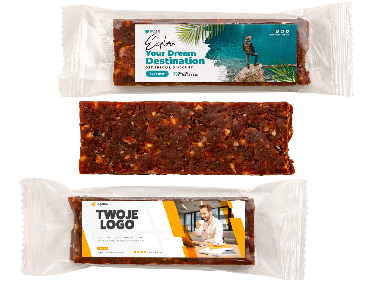 - rectangular sticker with full colour promotional print (CMYK) placed on front of the bar, small ingredient sticker placed on the back