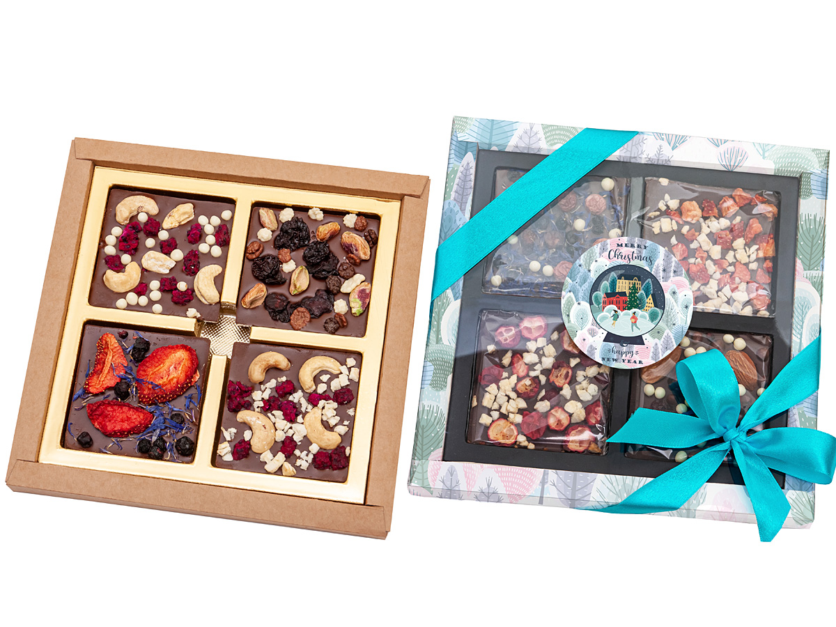 - 4 delicious milk chocolates 44% cocoa decorated with various freeze-dried fruits, nuts and sprinkles