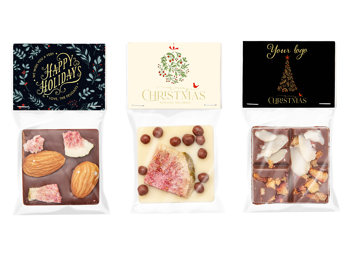 - available types: milk chocolate 44% cocoa with freeze-dried fig and almond; white chocolate with freeze-dried fig and milk chocolate balls; milk chocolate 44% cocoa with freeze-dried plum and almond flakes