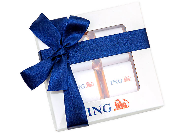 Set of 4 chocolates with delicate alcoholized cream filling wrapped in gold laminate and paper labels with promotional print.