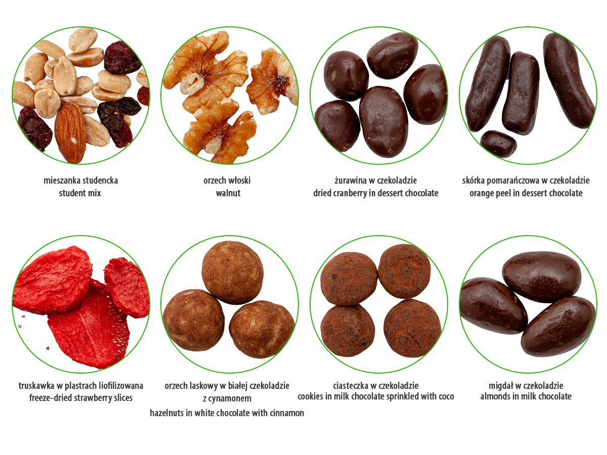 - available types: walnuts 45g, cookies in milk chocolate sprinkled with cocoa 45g, student mix 80g, almonds in milk chocolate 100g, dried cranberry in dessert chocolate 90g, orange peel in dessert chocolate 100g, hazelnut in white chocolate with cinnamon 100g, freeze-dried strawberry 10g