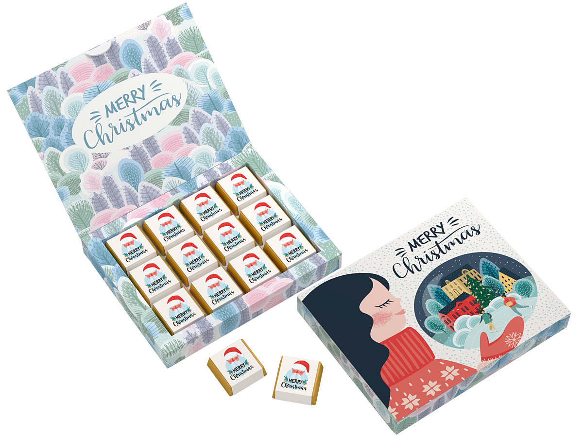 Set of 12 chocolates with delicate alcoholized cream filling wrapped in gold laminate and paper labels with promotional print.