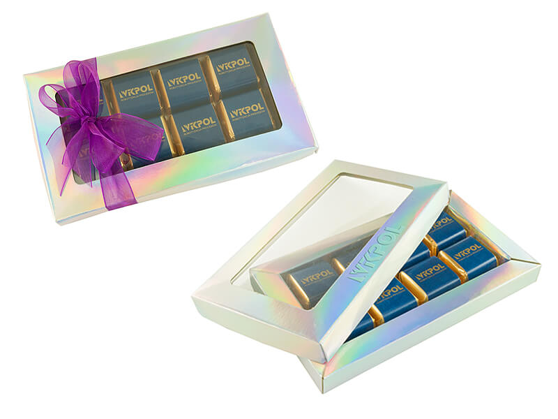Elegancki zestaw ośmiu czekoladek z delikatnym alkoholizowanym kremem zawiniętych w złoty laminat i obwoluty z nadrukiem reklamowym.