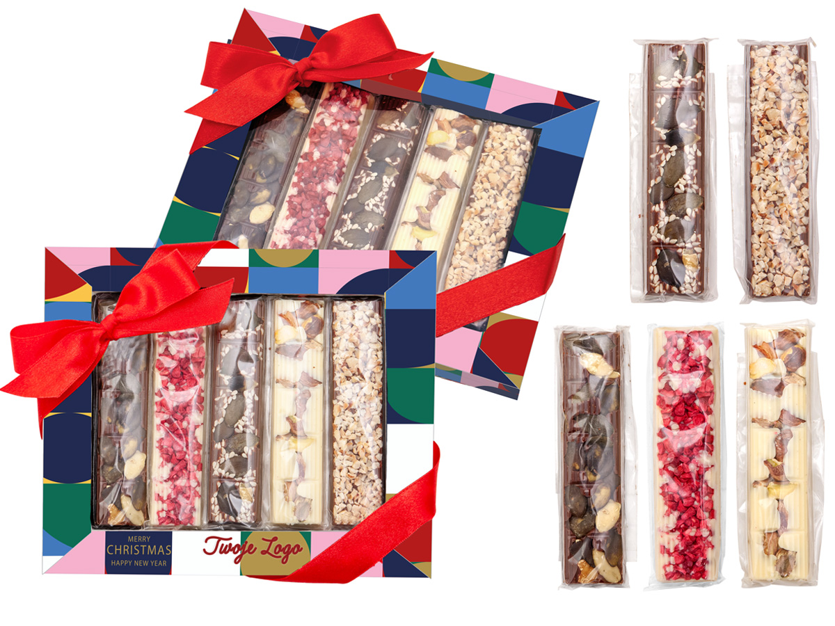 - smaki batonów: czekolada mleczna 44% z pestkami dyni, czekolada biała z liofilizowaną maliną, czekolada mleczna 44% z pestkami dyni oraz sezamem, czekolada biała z pistacjami, czekolada mleczna 44% z pokruszonymi orzechami laskowymi