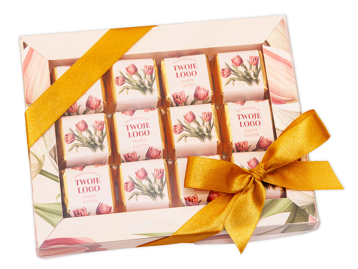 - czekoladki zawinięte w złoty laminat i kolorowe obwoluty reklamowe