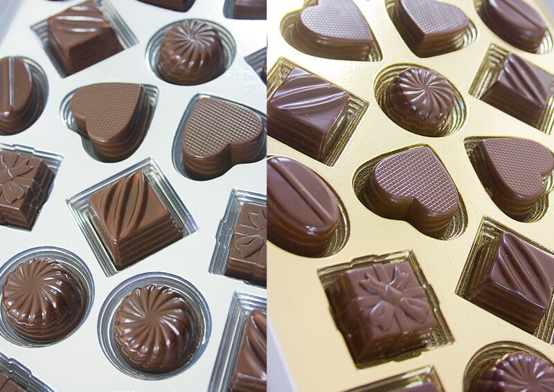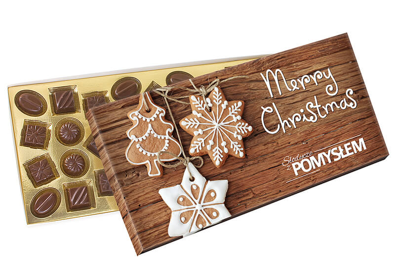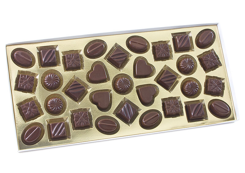 Bardzo duża bombonierka zawierająca 33 praliny z czekolady mlecznej 44% o różnych pięciu kształtach