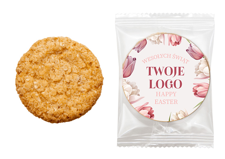 Kruche ciasteczka owsiane z dodatkiem sezamu, pakowane w przezroczyste saszetki foliowe typu flow-pack.