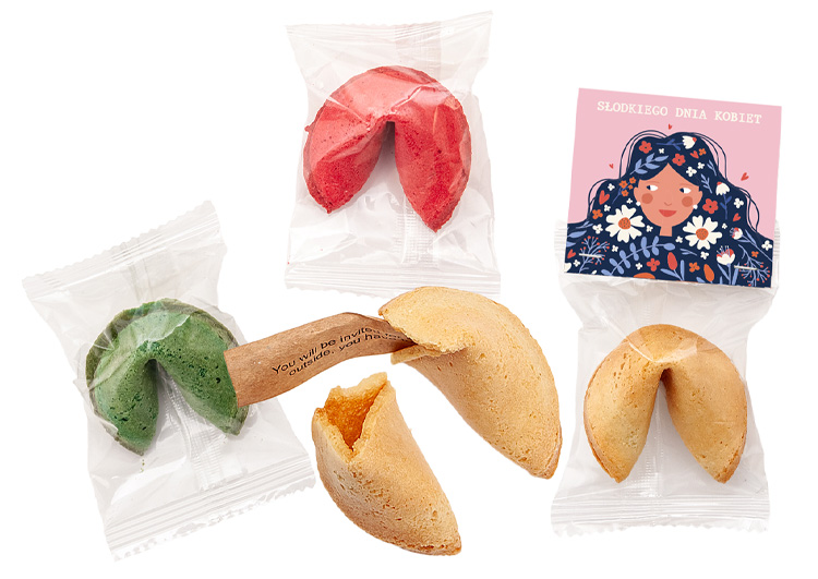 • wewnątrz ciasteczka papierowy pasek o wymiarach 58×12 mm ze standardową lub indywidualną wiadomością; do wyboru paski z białego lub brązowego papieru