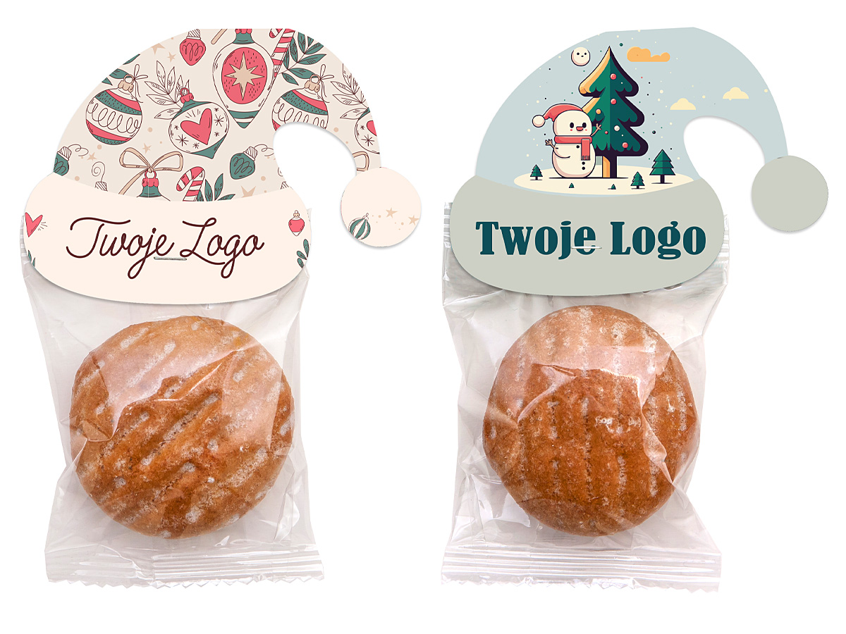 - Przepyszny pierniczek nadziewany marmoladą śliwkową, w przezroczystej torebce z fantazyjną kartonową zawieszką w kształcie czapki Mikołaja