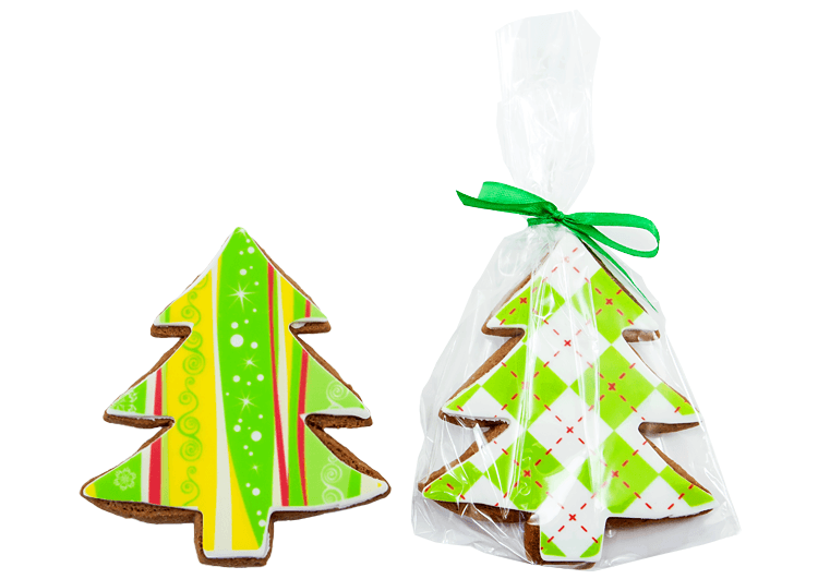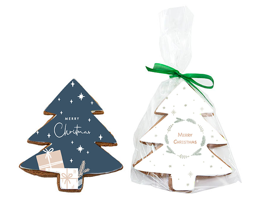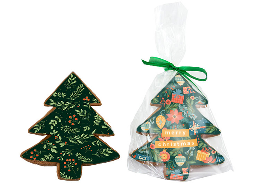 - Miodowe ciastko, w kształcie choinki, pokryte masą cukrową z dowolnym nadrukiem reklamowym CMYK