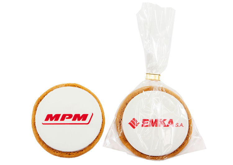 - miodowe ciastko, w kształcie koła, pokryte masą cukrową z dowolnym nadrukiem reklamowym CMYK