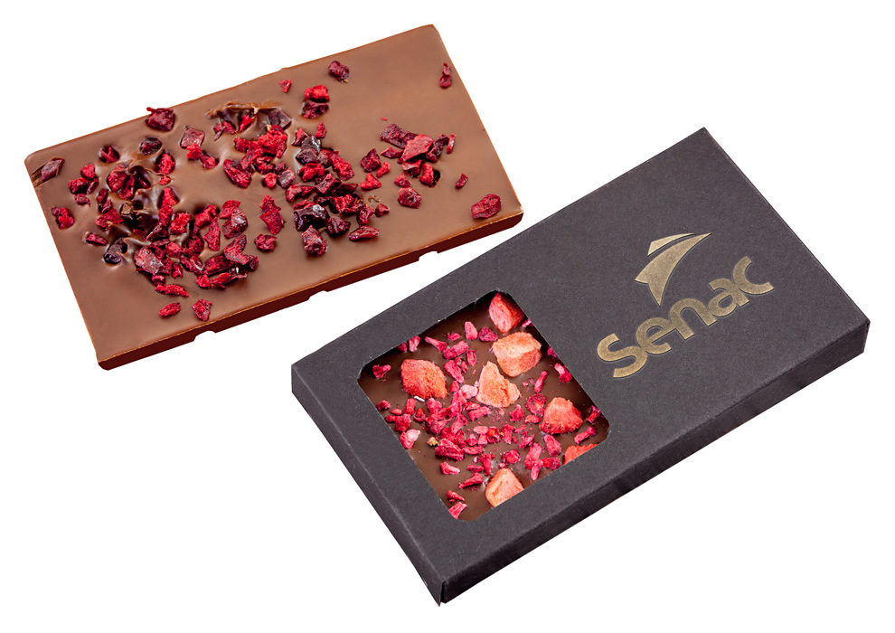 Niewielkie czekolady z zatopionymi owocami liofilizowanymi pakowane w pudełka kartonowe z „okienkiem”.