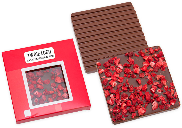 niewielkie czekolady w pudełkach z zatopionymi truskawkami liofilizowanymi.