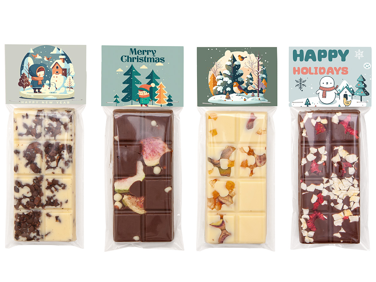 - dostępne smaki: czekolada biała z z kawą ziarnistą, czekolada mleczna 44% z liofilizowaną figą oraz czekoladowymi kulkami, czekolada biała z kandyzowaną skórką pomarańczy oraz pistacjami, czekolada mleczna 44% z liofilizowanym jabłkiem oraz wiśnią