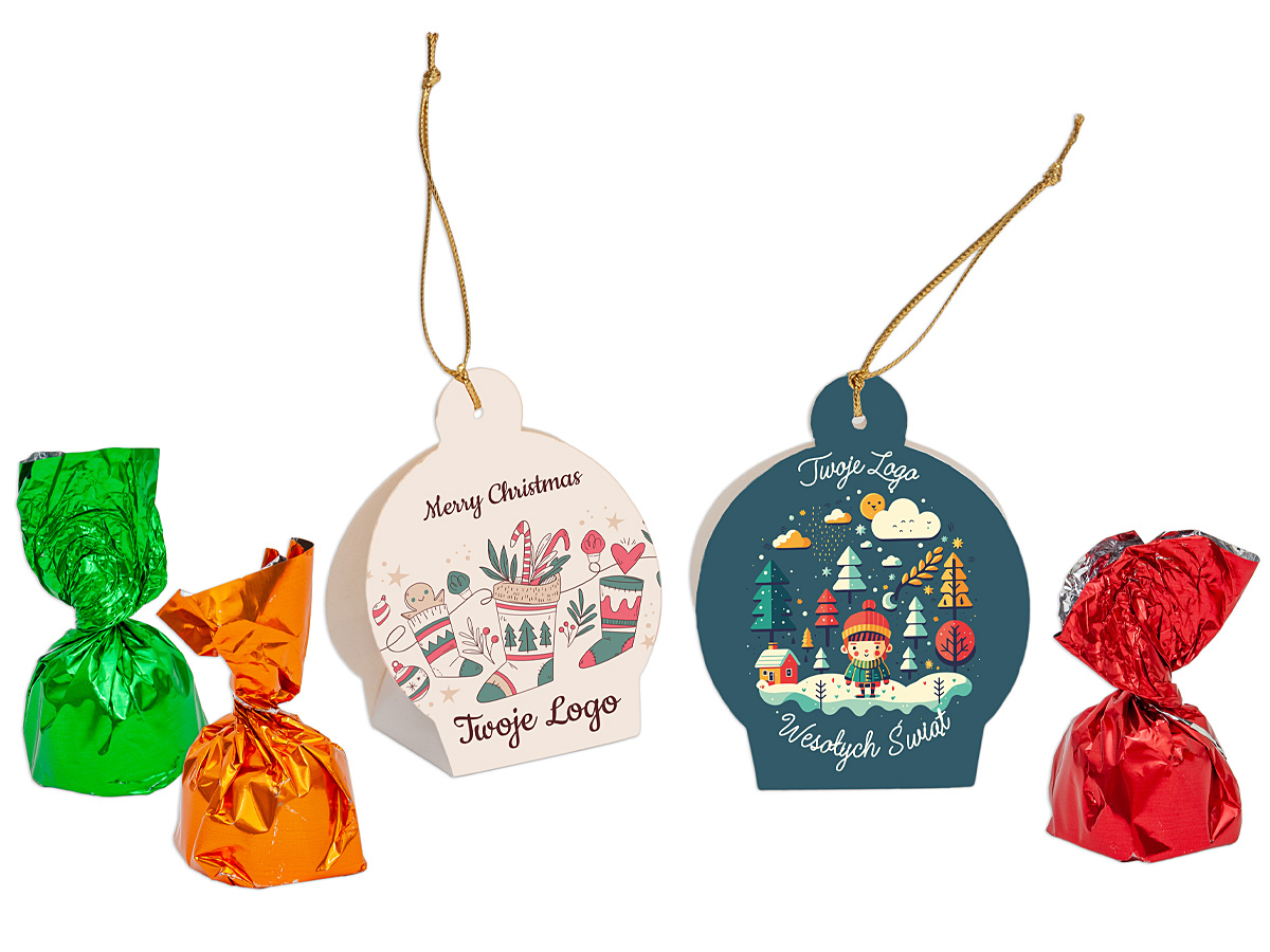 Czekoladki pakowane pojedynczo w kartonowe pudełeczka w kształcie bombki.