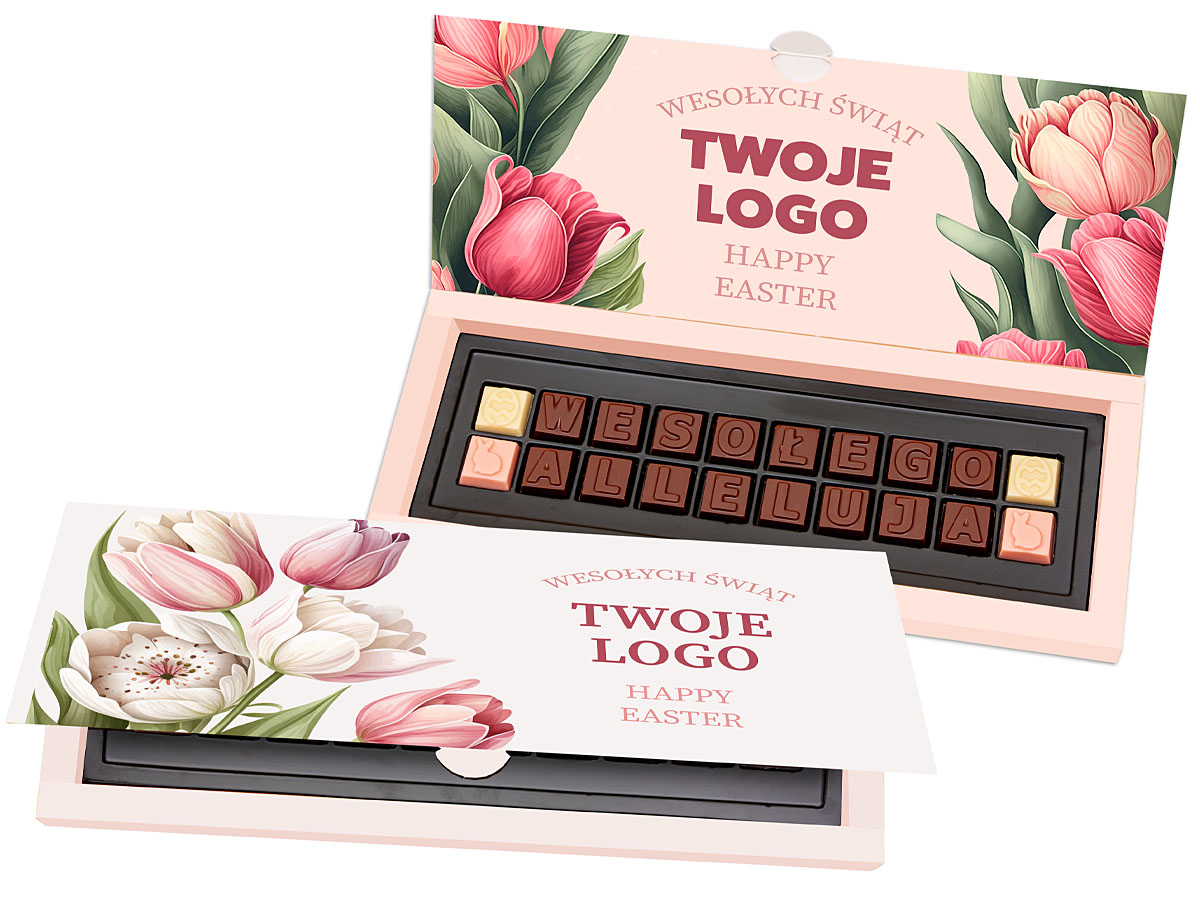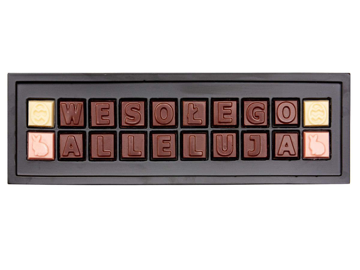 Życzenia Wielkanocne składające się z 16 czekoladek z literami i 4 czekoladek z motywem świątecznym