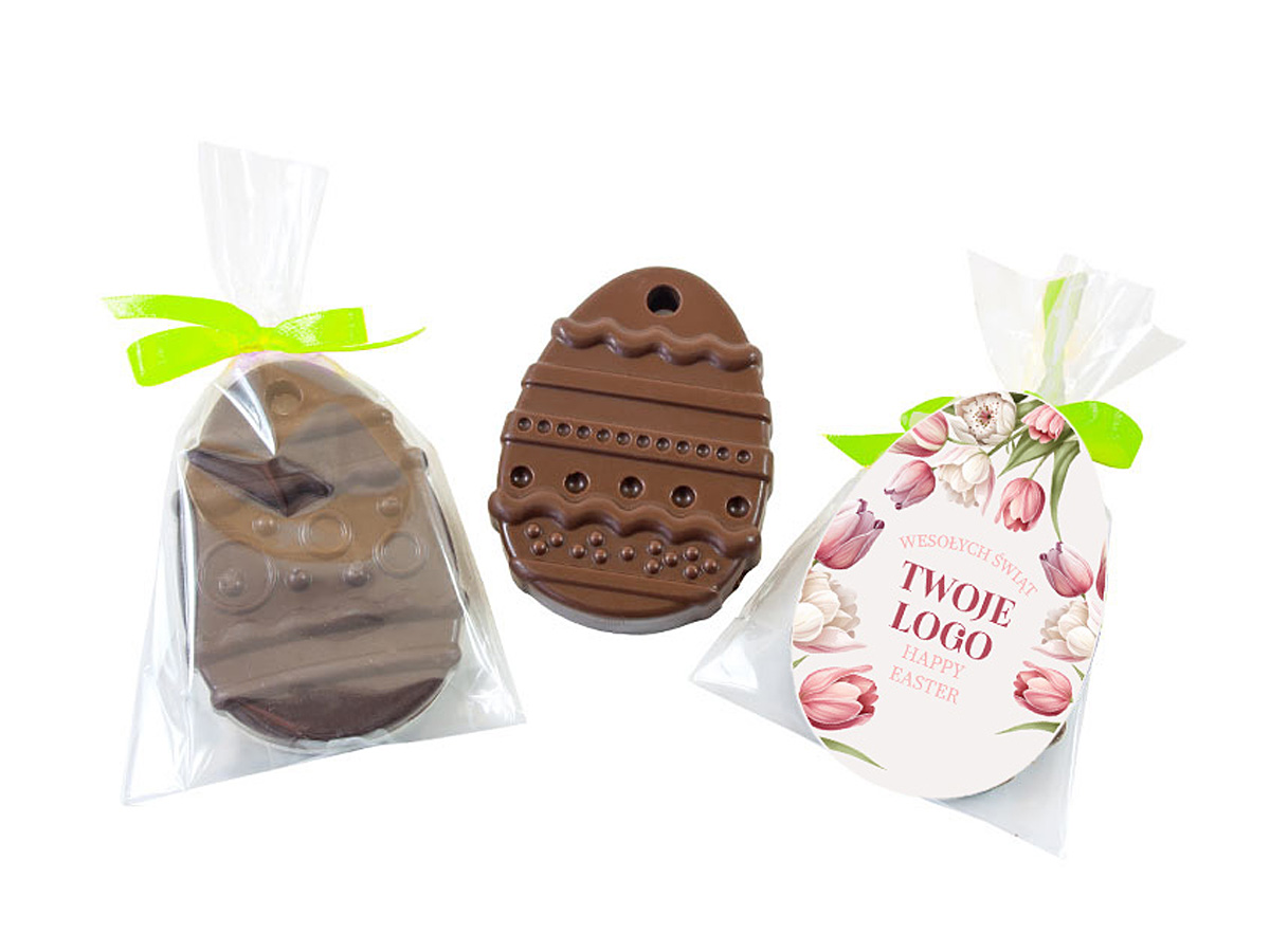 Niewielka czekolada w kształcie jajka z motywami wielkanocnymi.