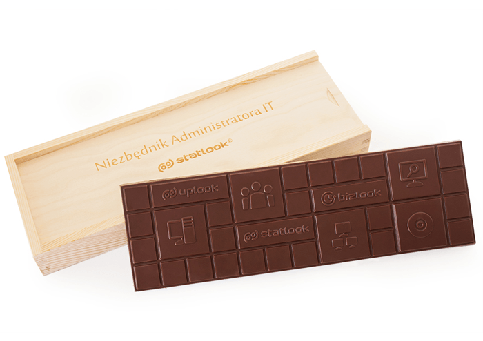 Czekolada mleczna 44% składająca się z 42 kostek oraz pola o wymiarach 54 x 200 mm przeznaczonego na tłoczenie na czekoladzie logotypów lub motywów graficznych