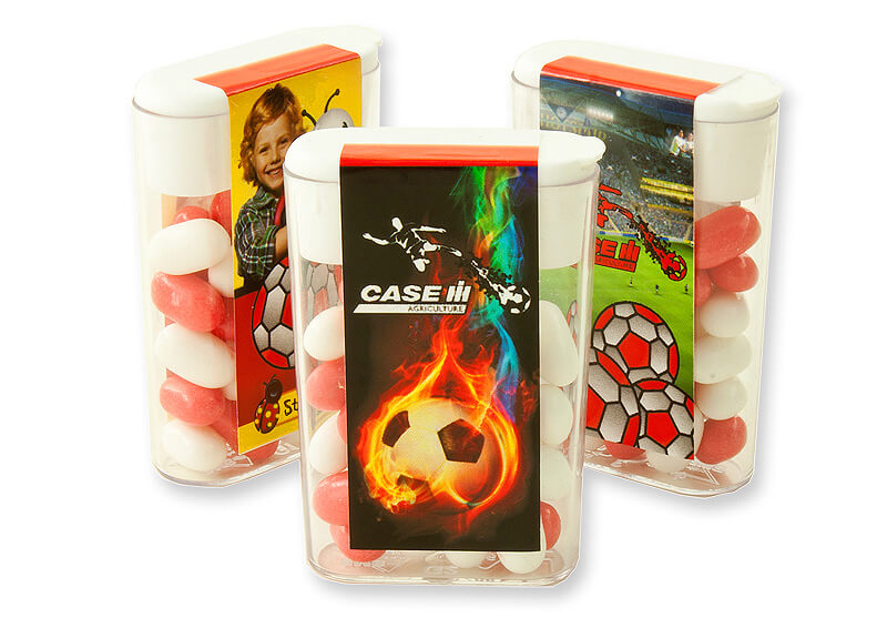 Odświeżające drażetki w pudełeczku z przeźroczystego PCV oklejonym z obydwu stron etykietą reklamową.