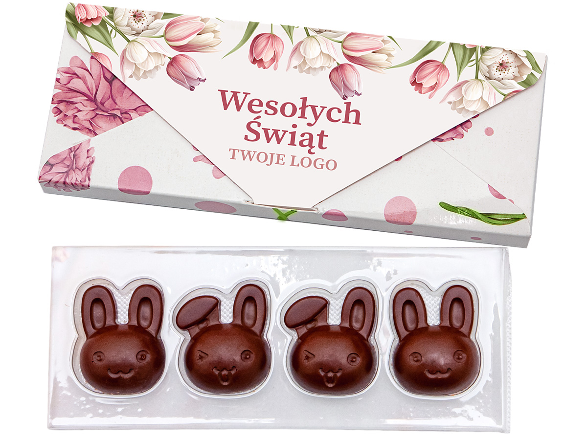 Uroczy mini zestaw na Wielkanoc składający się z czterech czekoladowych zajączków