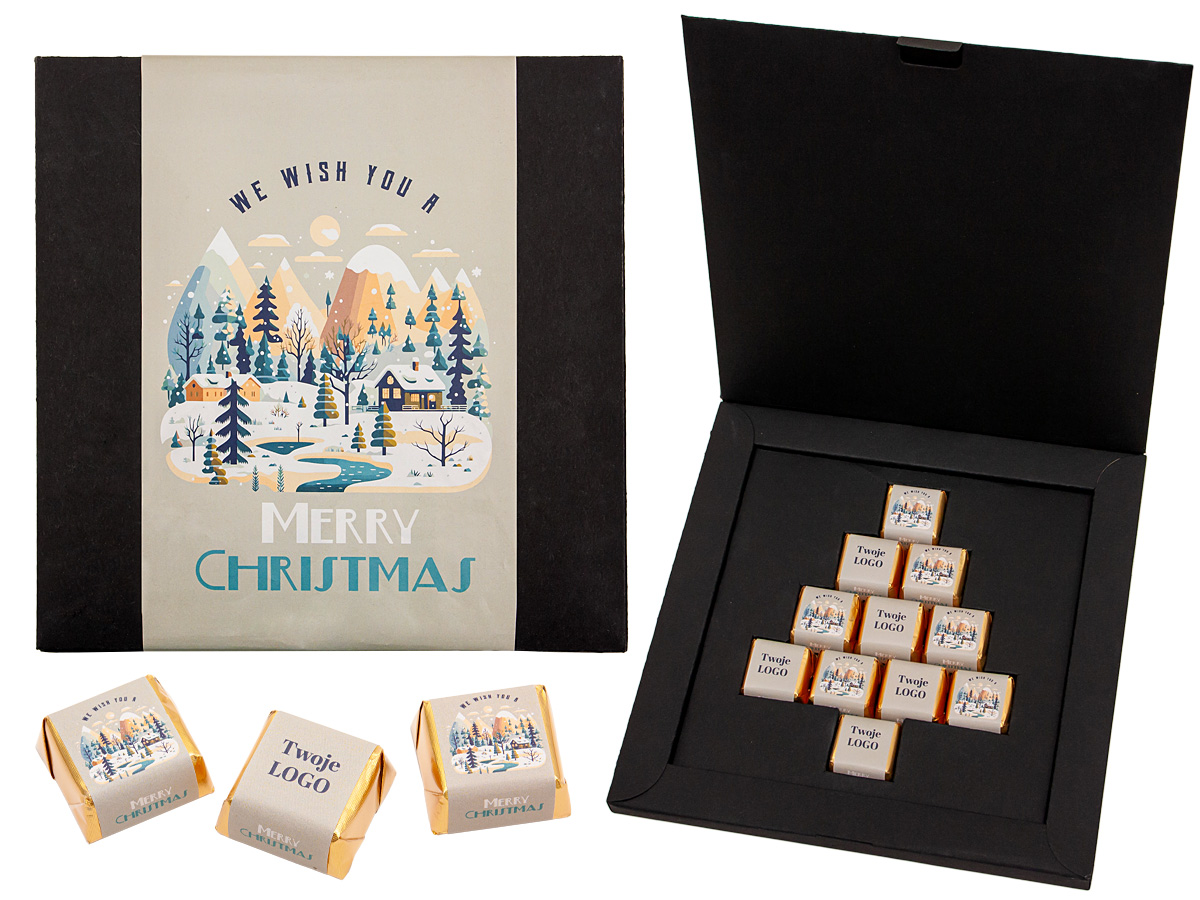 - 11 czekoladek mlecznych z lekko alkoholizowanymi nadzieniami ułożone na kształt choinki