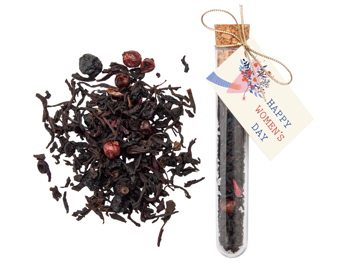• podarunek składający się z fiolki wypełnionej liściastą herbatą