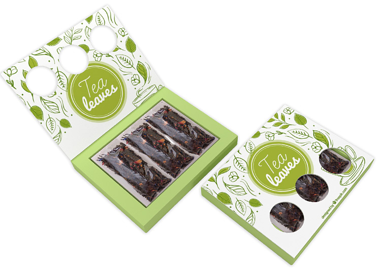 • elegancki zestaw z trzema aromatycznymi herbatami liściastymi w pudełku reklamowym z okienkami,