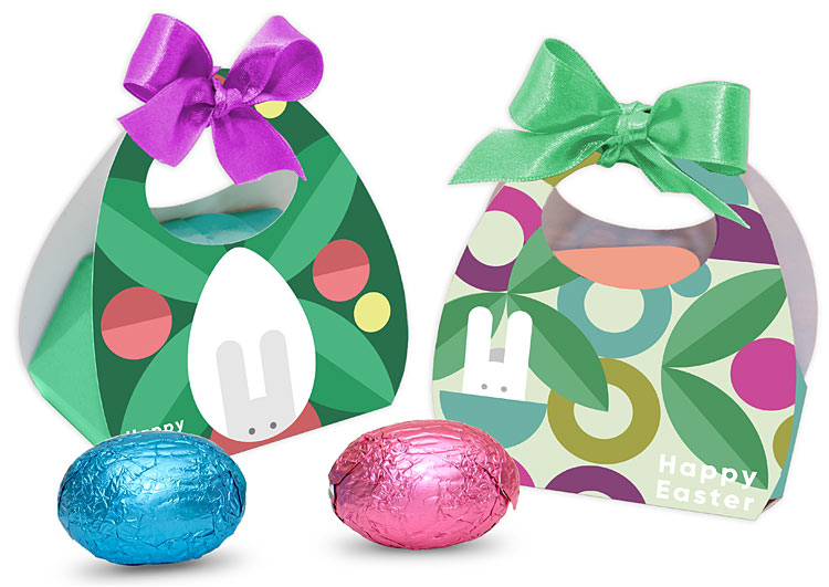 Koszyczek wielkanocny zawierający 5 czekoladek w kształcie jajka.