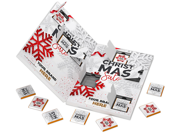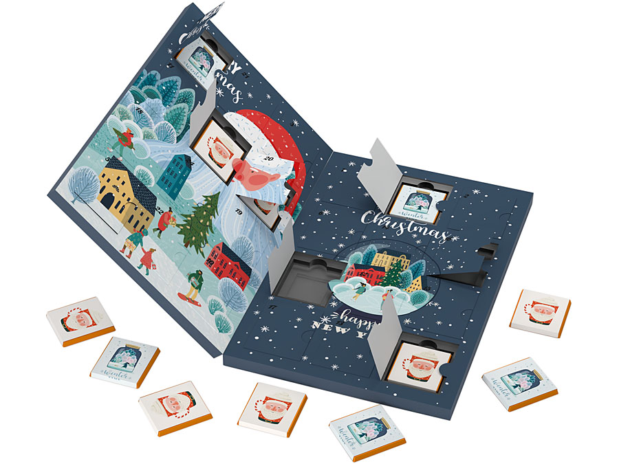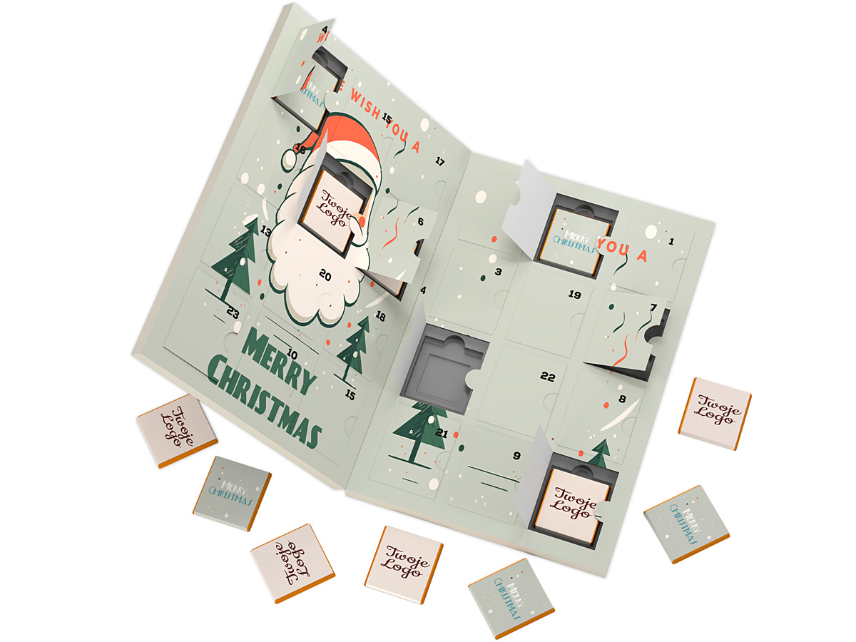 • efektowny kalendarz adwentowy zawierający 24 czekoladki belgijskie zawinięte w obwoluty z nadrukiem reklamowym CMYK lub do 4 kolorów Pantone