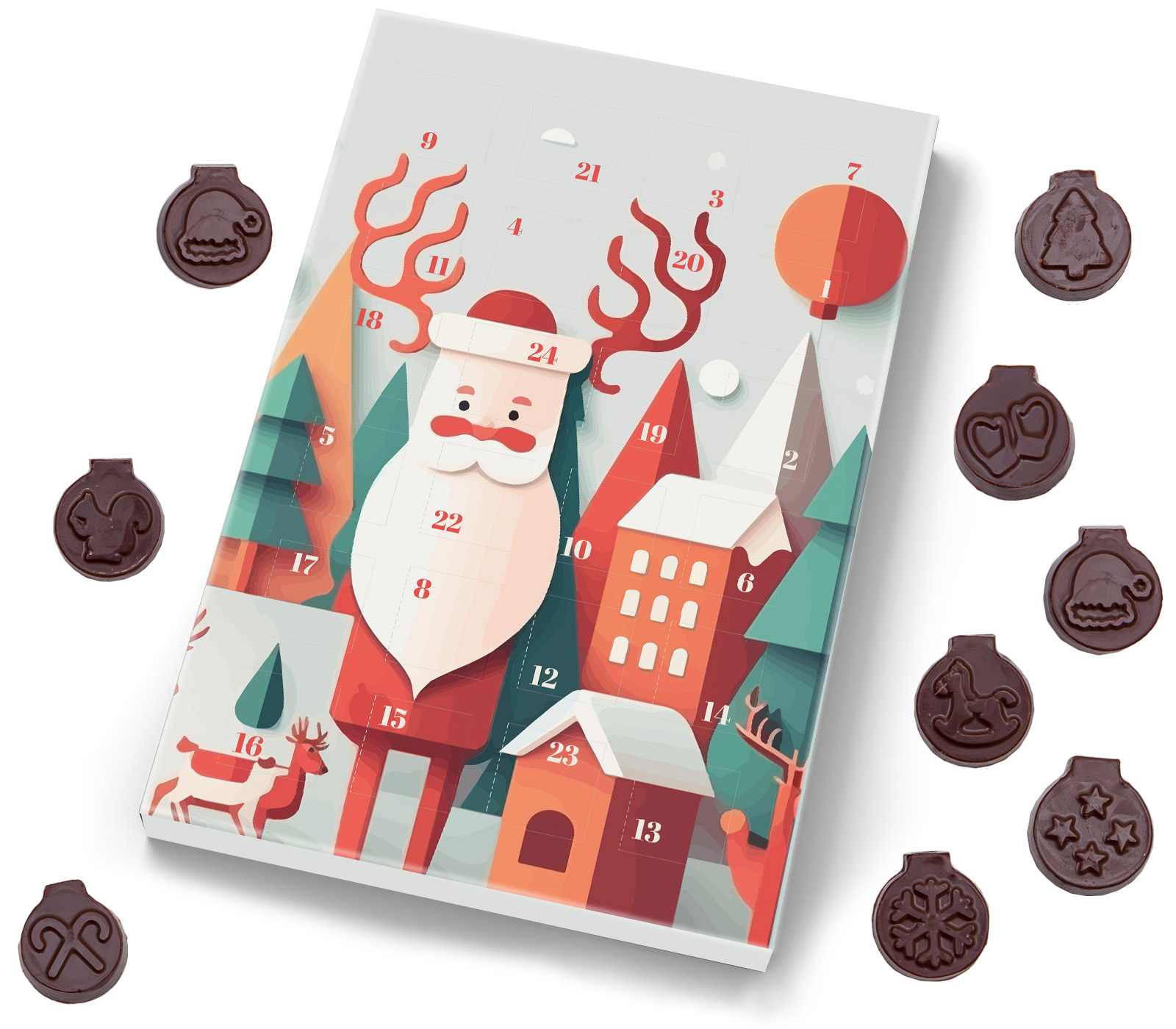 kalendarz adwentowy zawierający 24 czekoladki w kształcie bombek z wytłoczonymi motywami nawiązującymi do Świąt Bożego Narodzenia
