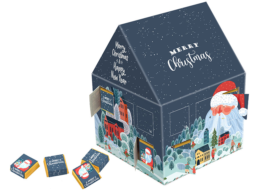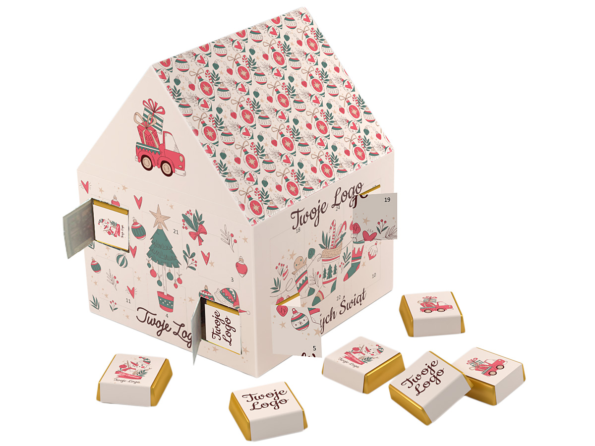 Duży kalendarz adwentowy w kształcie domku, zawierający 24 markowe czekoladki z delikatnym alkoholizowanym nadzieniem pistacjowym oraz czekoladowym