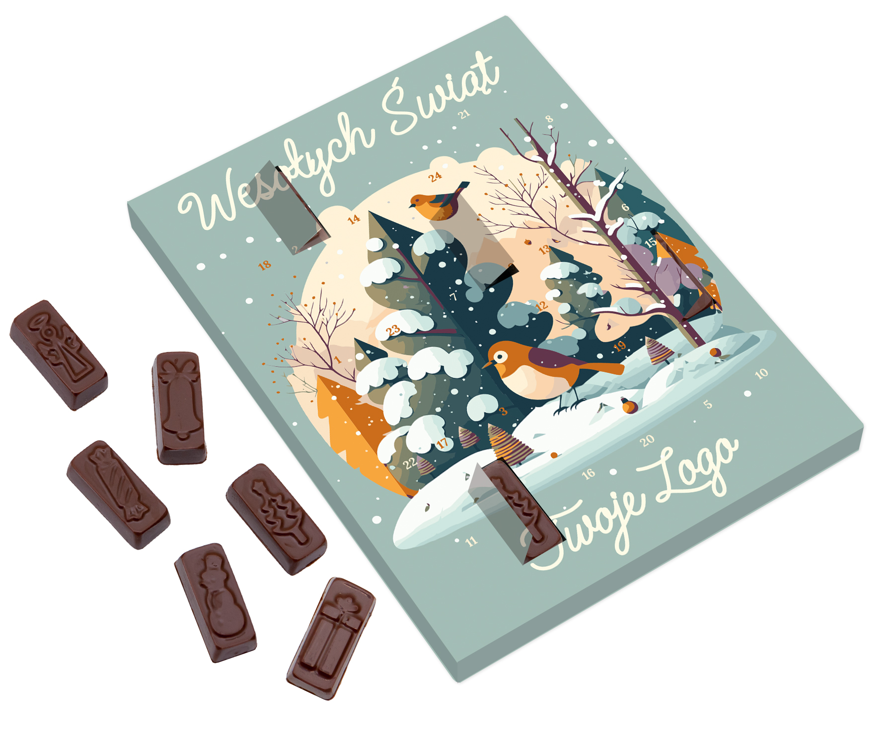 - Niewielki kalendarz adwentowy zawierający 24 prostokątne czekoladki z wytłoczonymi motywami nawiązującymi do Świąt Bożego Narodzenia