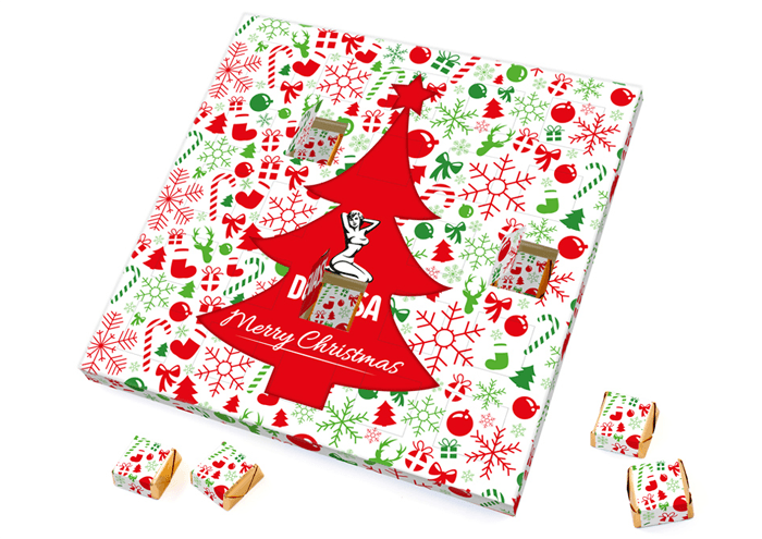 - czekoladki zawinięte w złoty laminat i obwoluty z motywami świątecznymi lub reklamowymi jednakowymi na wszystkich czekoladkach lub każda czekoladka z inną grafiką