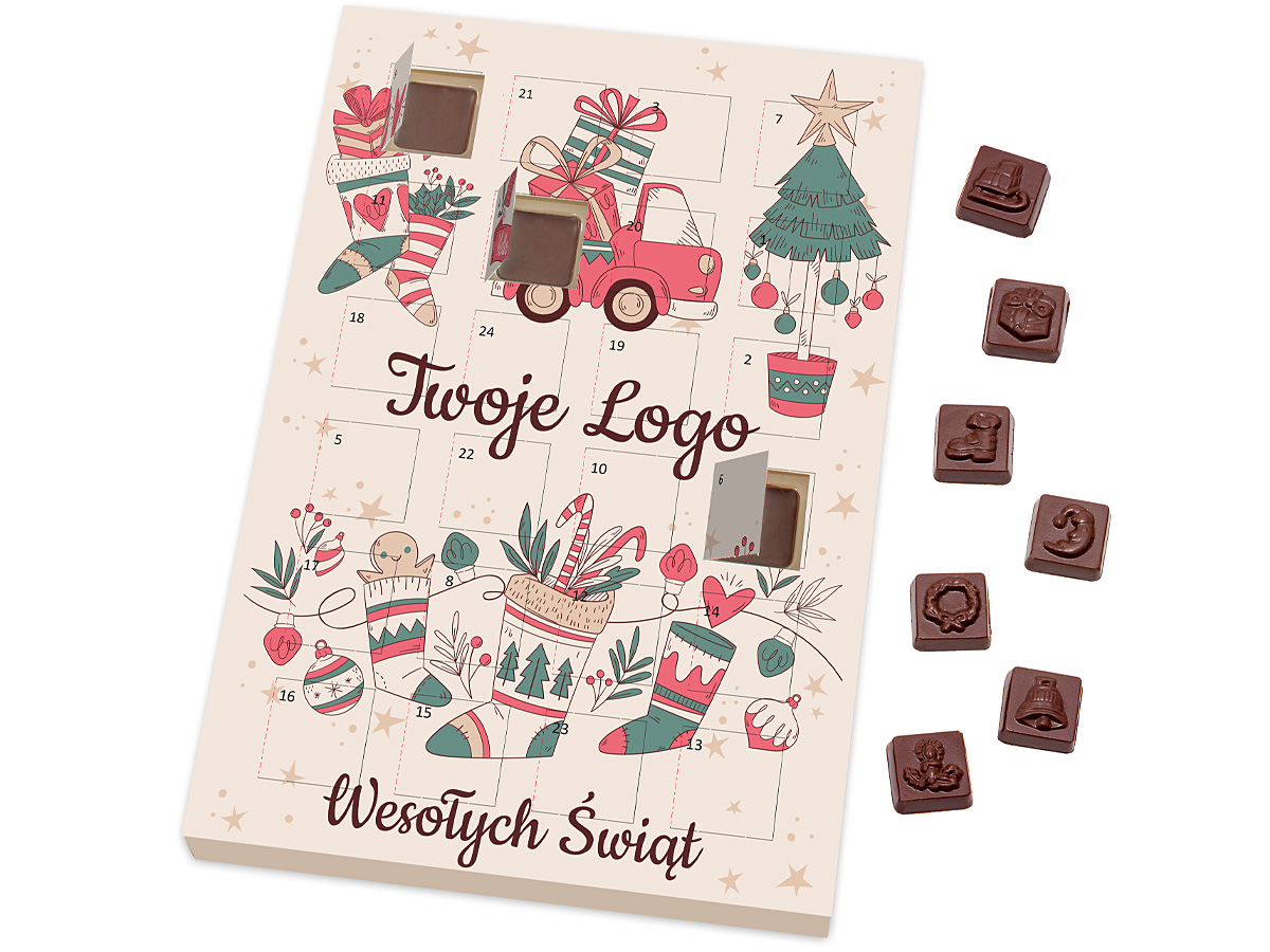 24 prostokątne czekoladki z wytłoczonymi motywami nawiązującymi do Świąt Bożego Narodzenia