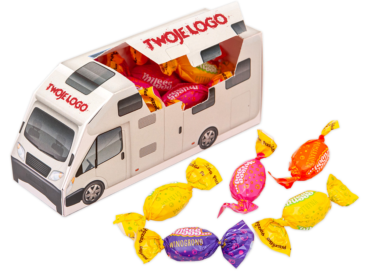 • Opakowanie w kształcie kampera wypełnione musującymi cukierkami (mix smaków)