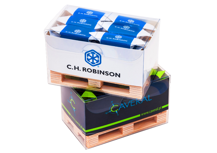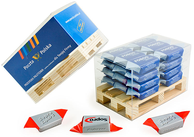24 pyszne krówki mleczne, zawinięte w firmowe etykiety z nadrukiem reklamowym i ułożone w czterech warstwach na drewnianej paletce.