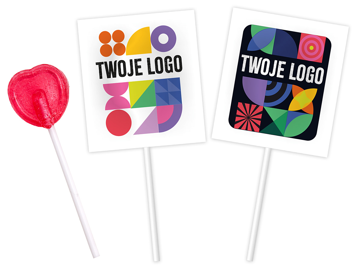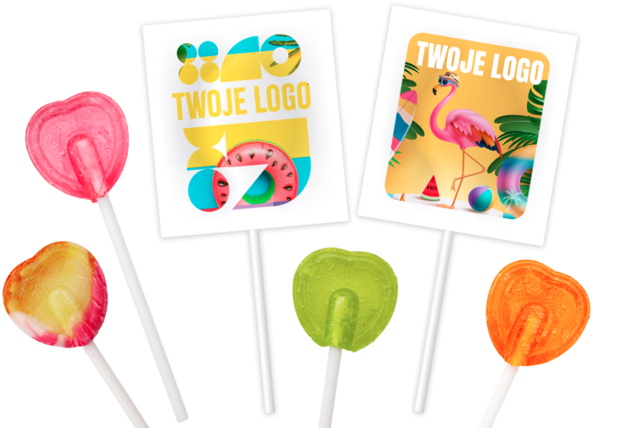 Małe, płaskie lizaki owocowe w kształcie serca.
