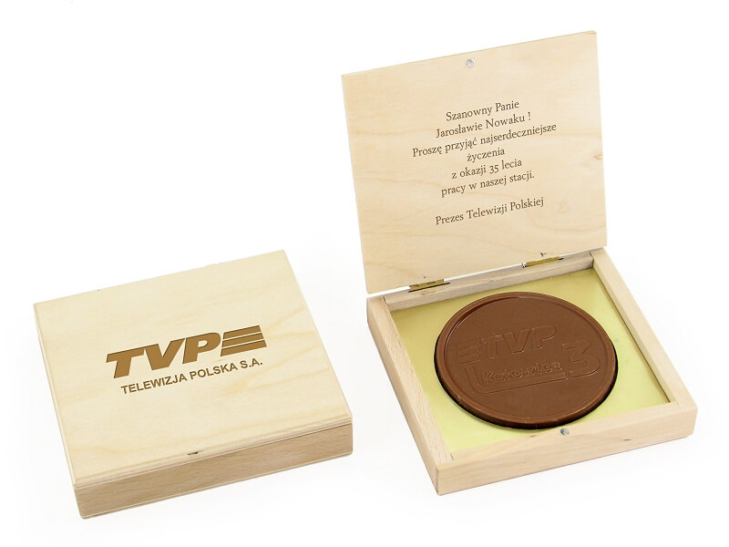 Jednostronne medale z wysokiej jakości czekolady belgijskiej mlecznej 44% o średnicy 100 mm.