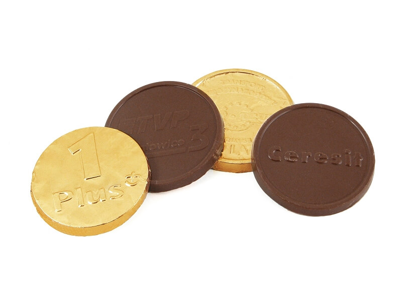 Jednostronne medale z czekolady belgijskiej mlecznej 44% o średnicy 55 mm.