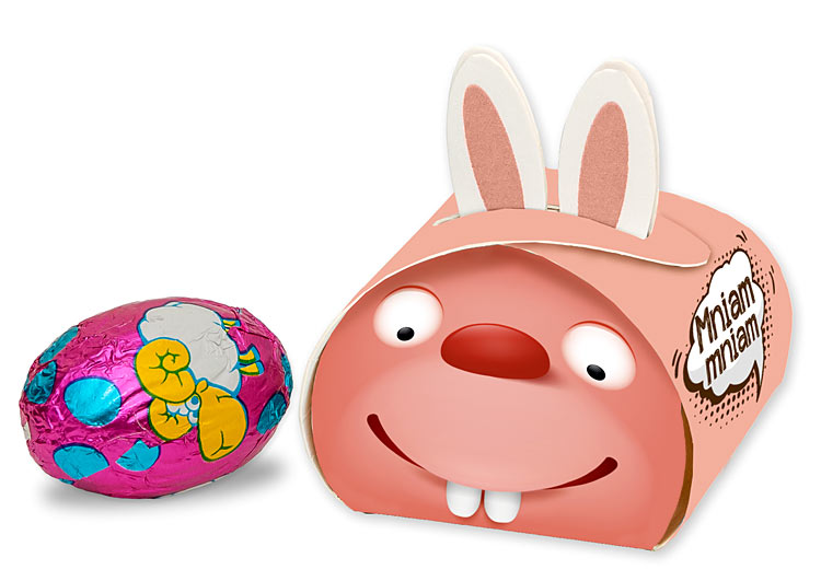 • urocze pudełeczko z uszami zawierające 1 czekoladowe jajeczko